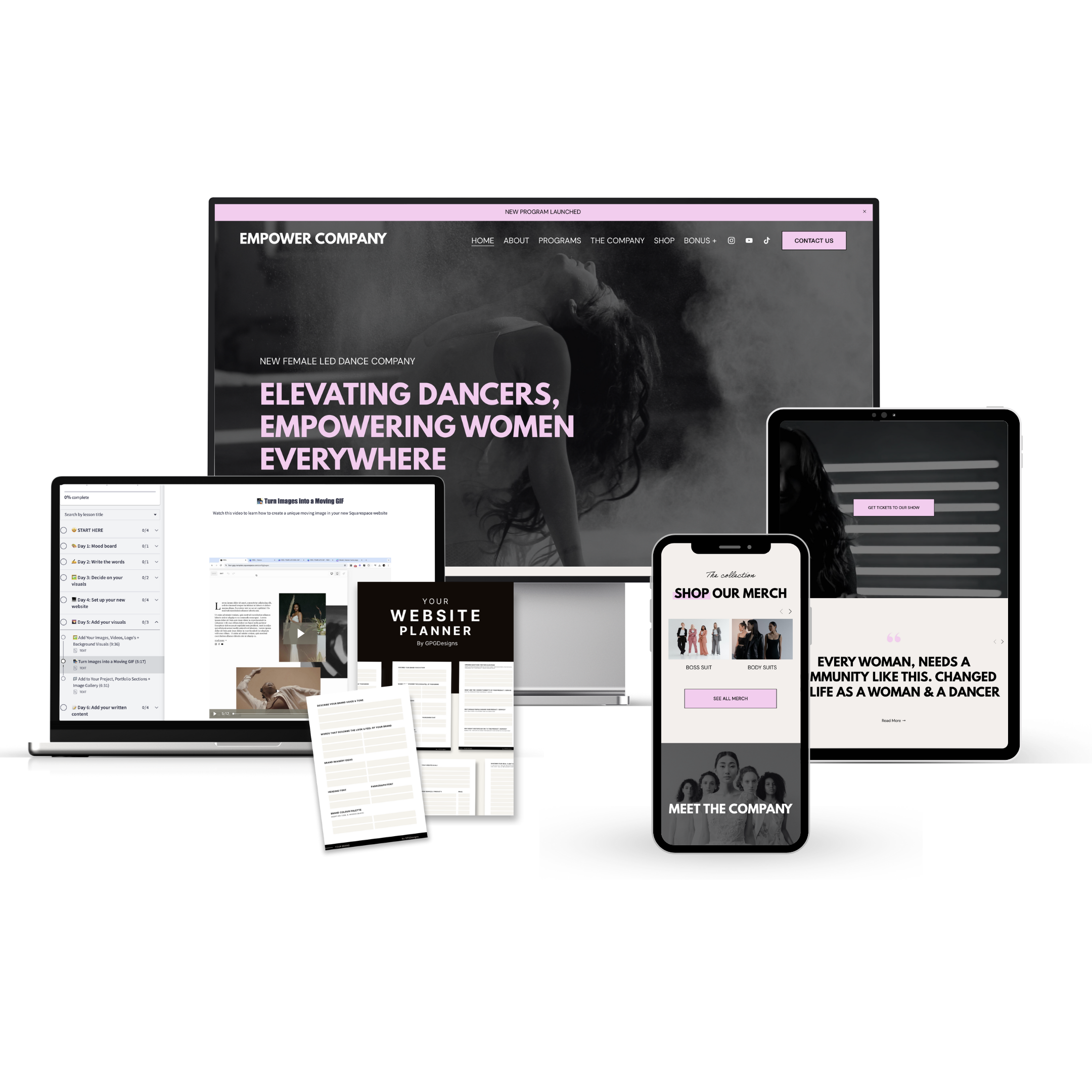 The Empower Template is a bold, high-converting 7+ page Squarespace website template designed for dance studios, movement brands, and creative entrepreneurs to sell their programs, book their classes, showcase their projects plus much more.